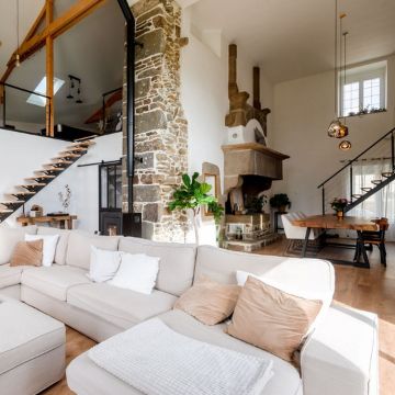 Nous nous sommes installés dans notre maison il y a environ 4 ans. C’est une longère bretonne qui date de 1584 que nous rénovons en alliant le moderne à l’ancien, tout en conservant l’âme de la maison. Nous y avons créé une extension avec une hauteur sous plafond de 8 mètres de haut et dès le début de la rénovation nous avons décidé d’y installer un poêle à granulés.
