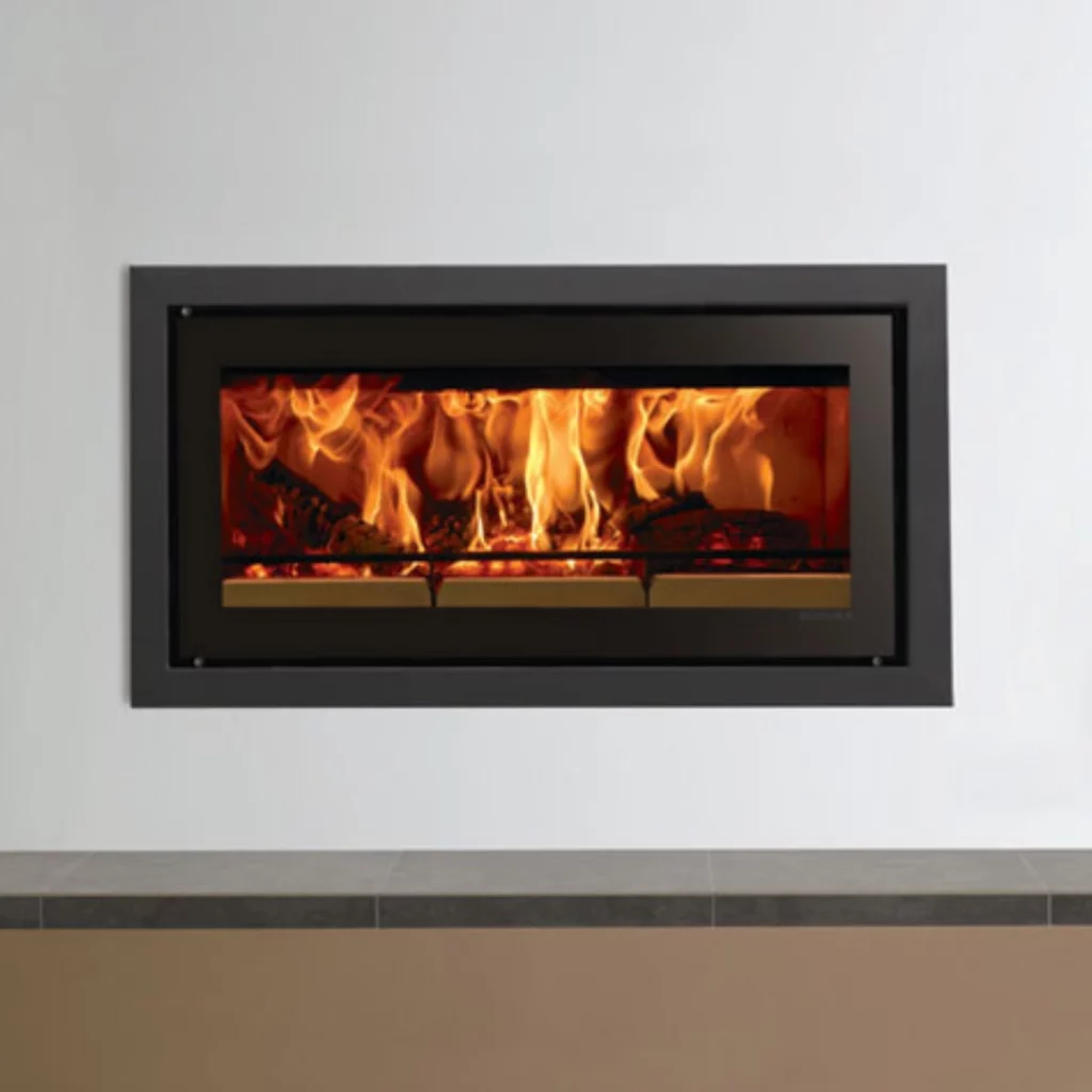 studio Edge : pour un look classique effet « trou dans le mur », le contour invisible de cet insert à bois contemporain permet d’apprécier le spectacle d’un jeu de flammes.