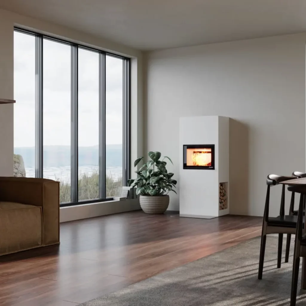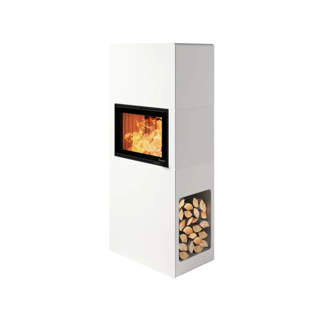 Découvrez le Stockholm de Nordpeis, un modèle élégant intégrant un insert haut pour une vision optimale du feu. Son design comprend un espace de rangement pour le bois accessible des deux côtés, offrant un look minimaliste. Grâce à sa paroi arrière antifeu, l’installation est simplifiée, permettant une pose contre des murs combustibles sans risques.